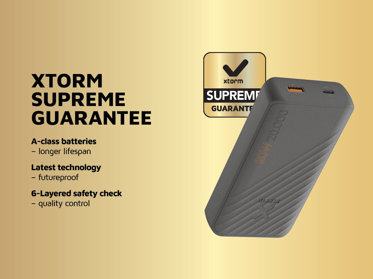 This Power Bank with 20W Super FastCharge and a capacity of 20,000mAh has an excellent price-to-quality ratio. Especially for true Xtorm fans, this Power Bank is packed with the best and latest technologies and specs! This Power Bank is suitable for both current and future devices. Cheaper power banks lose power over time or no longer charge as quickly. With the high-quality Xtorm SuperCharge Power Bank you, as a fan, are guaranteed to have #MoreEnergy for years to come!