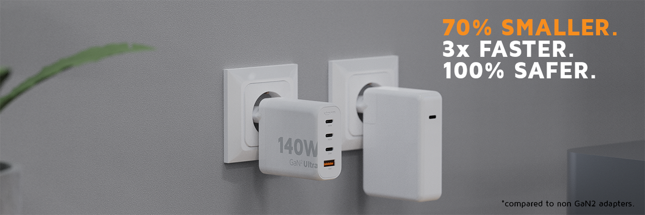 Don't be fooled by its size, this 140W Wall Charger packs a punch when it comes to power. GaN² Ultra – the next generation of GaN technology – allows our charger to safely and efficiently handle more power in an even smaller size.